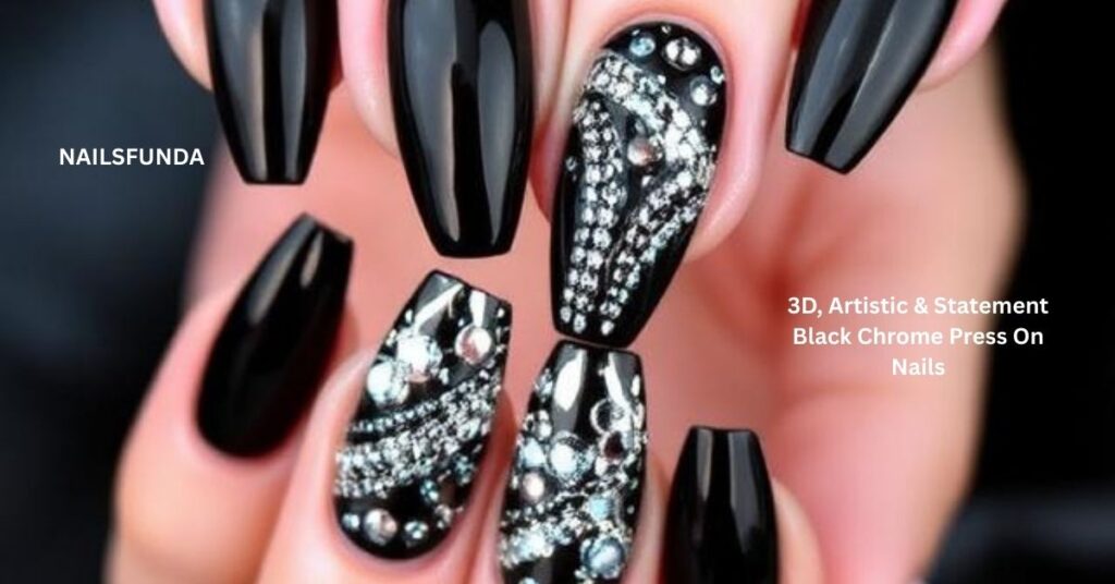- Black chrome press-on nails with modern 3D glamour