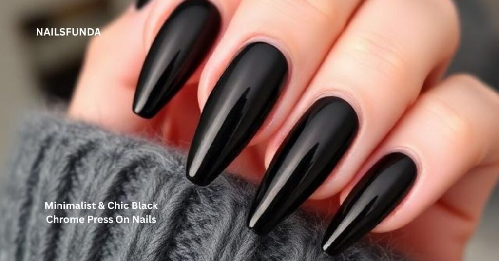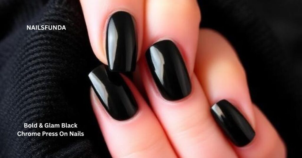 - Black chrome press-on nails with bold fashion presence