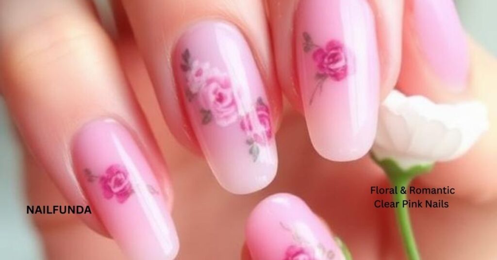- Transparent pink almond nails with soft rose motifs